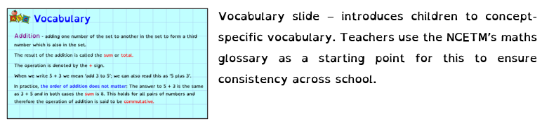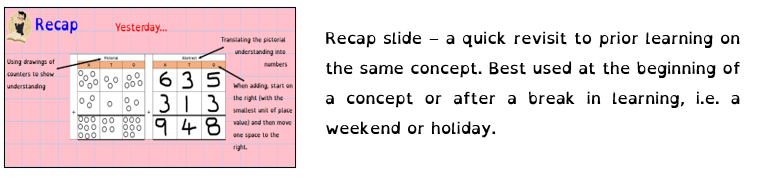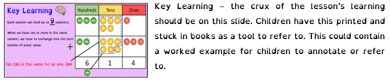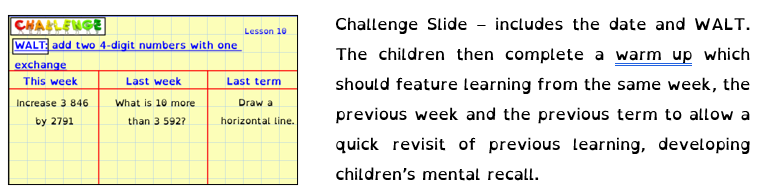 Teachers use the same format to deliver Maths across the Key Stage to ensure learning and lessons are consistent. The children can prioritise their learning without unnecessary cognitive overload.