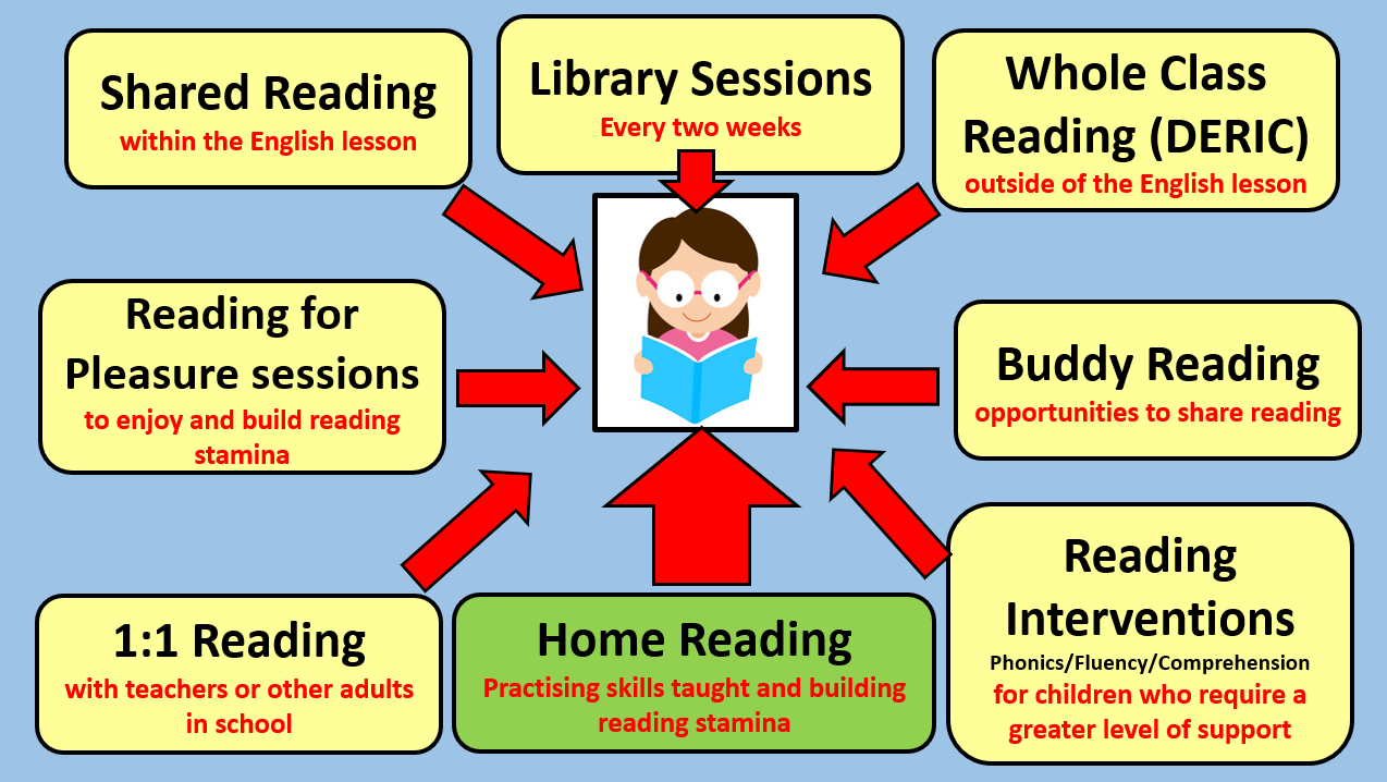 The children then complete a range of activities based on the texts read that develop their comprehension skills.  DERIC is used to cover the different strands of reading. Work is completed within Reading Journals.
